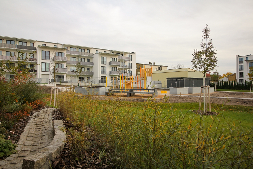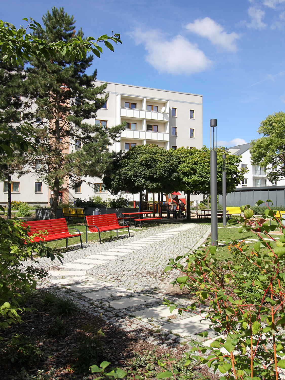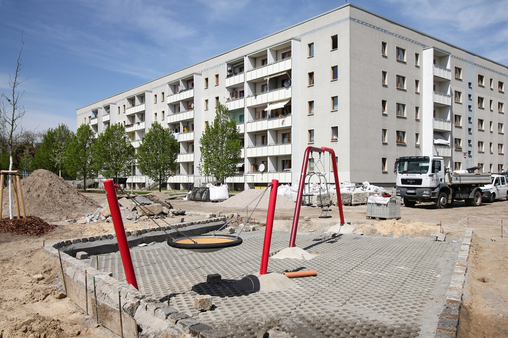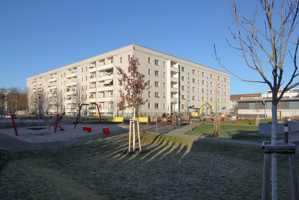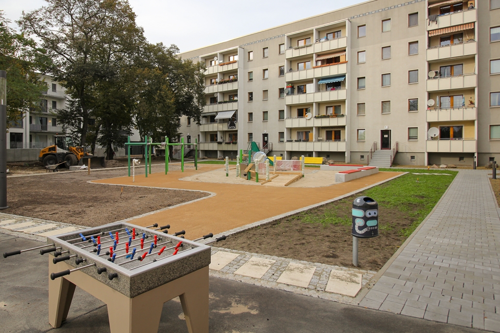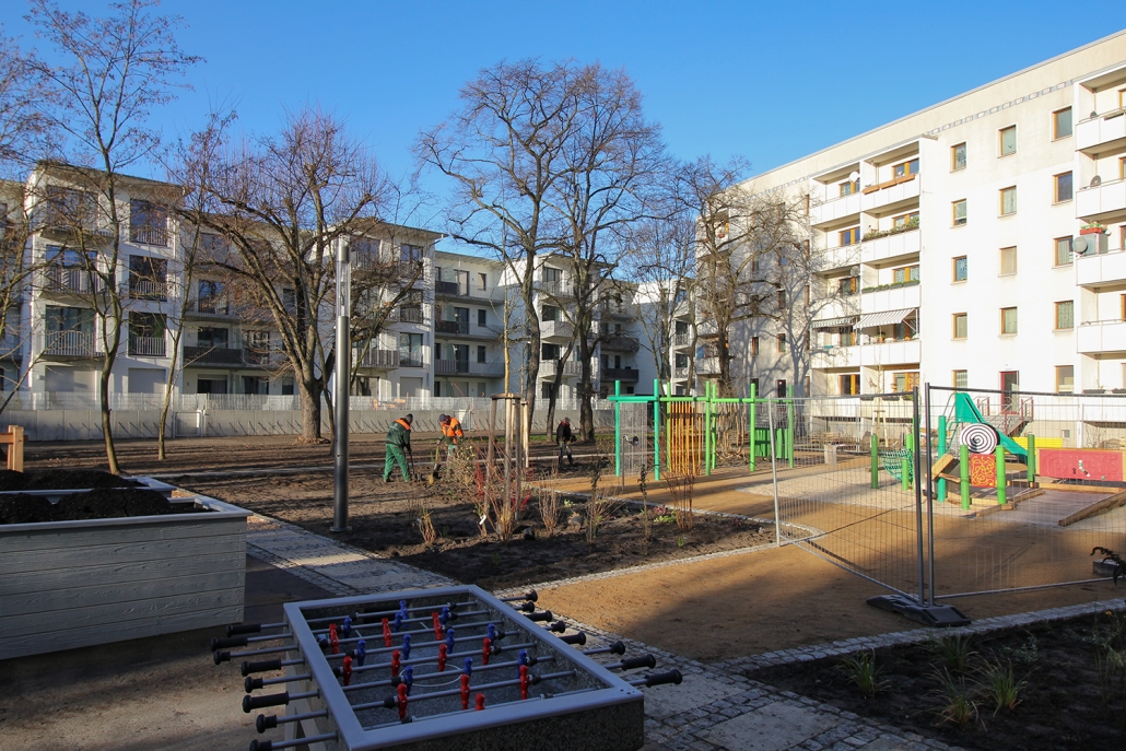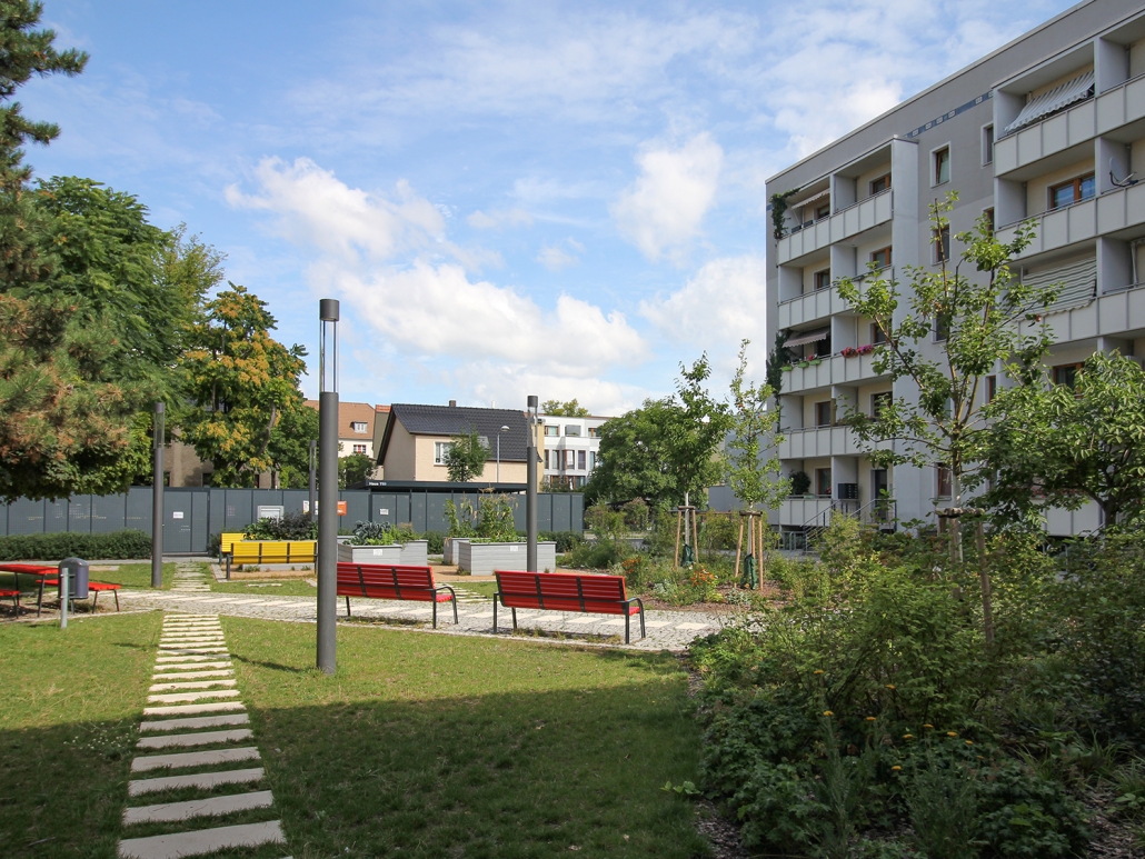 Die südlich und südöstlich an die Wohnblöcke Albert-Schweitzer-Straße 3-5 angrenzenden Freiflächen lagen teilweise ungenutzt brach. Heute verbinden sie das „alte“ Albert-Schweitzer-Quartier und die an der Fabrik-, August-Conrad- und Berliner Straße entstandene neue Wohnbebauung. Robuste und wartungsarme Outdoormöbel und Spielgeräte, neue Wege und Plätze sowie eine höhengestaffelte Bepflanzung aus bodendeckenden Gehölzen, Stauden und Gräsern, Solitärsträuchern und Laub- und Obstbäumen sorgen für eine hohe Aufenthaltsqualität für alle Altersgruppen. Durch das gesamte Quartier zieht sich ein Grüngürtel aus heimischen Pflanzen, die zur Steigerung der Biodiversität beitragen. Darin eingebettet finden sich Spiel- und Sportflächen mit Angeboten für verschiedene Altersgruppen, Aufenthalts- und Rasenflächen zur freien Nutzung, Hochbeete zum gemeinsamen Gärtnern, ein Bouleplatz, Wäschetrockenplätze und Sitzecken. Die im Quartier bereits vorhandenen Spielgeräte wurden durch weitere Anlagen zum Balancieren, Klettern, Hangeln, Rutschen und Schaukeln ergänzt. Bei der Auswahl lag der Fokus auf Spielgeräten, die sich gemeinschaftlich nutzen lassen. Der alte Bolzplatz wurde durch ein Multisportfeld mit Toren, Streetballkorb und lärmminderndem Kunststoffbelag ersetzt. Kleine Kletterfelsen sowie mehrere Fitnessgeräte laden zur sportlichen Betätigung ein.