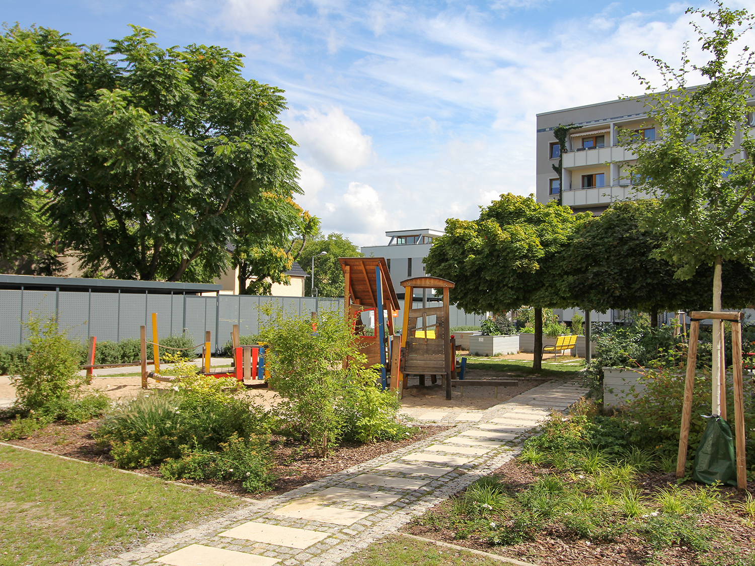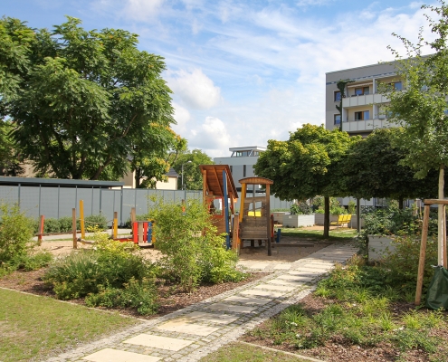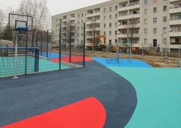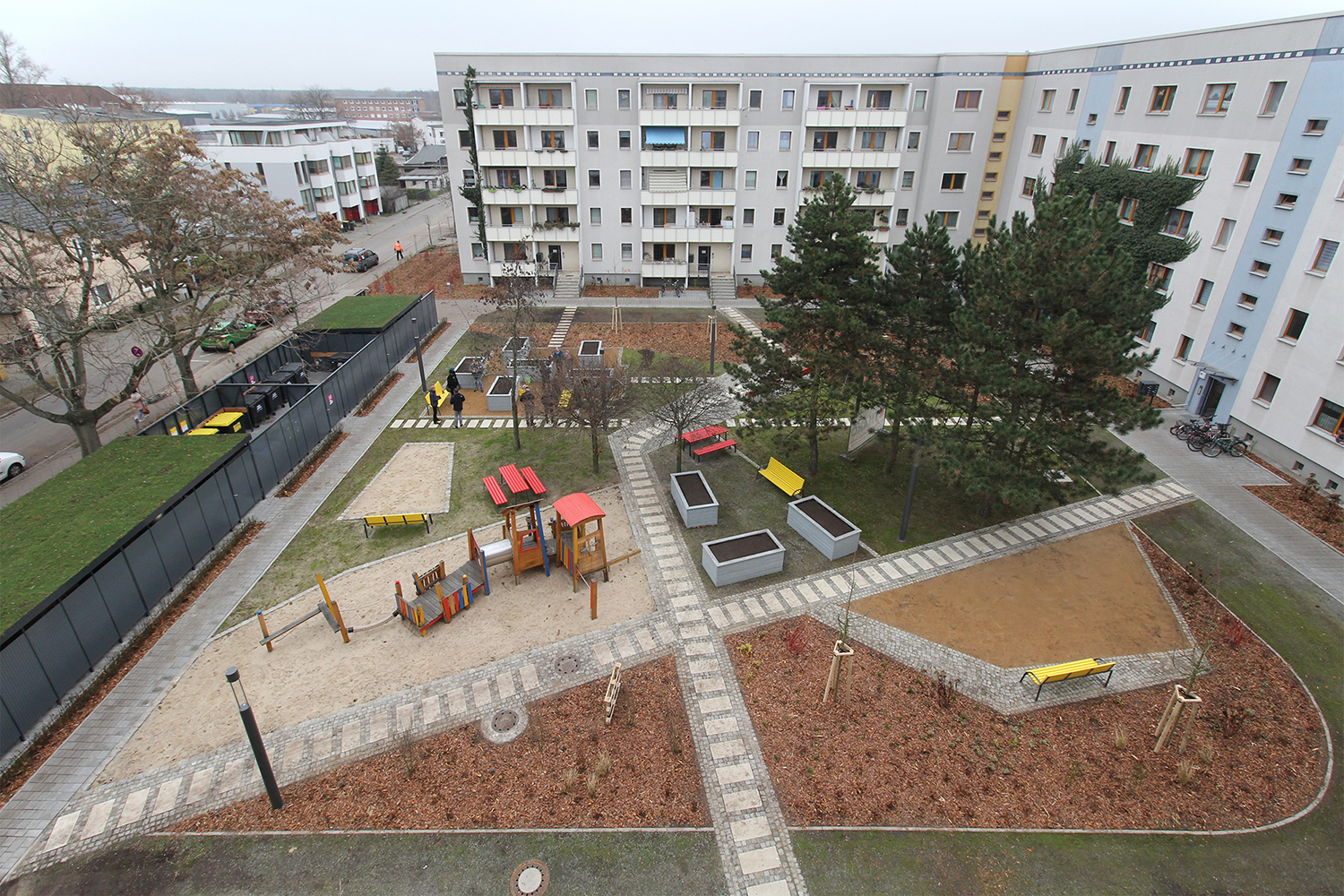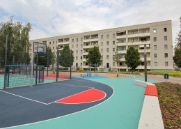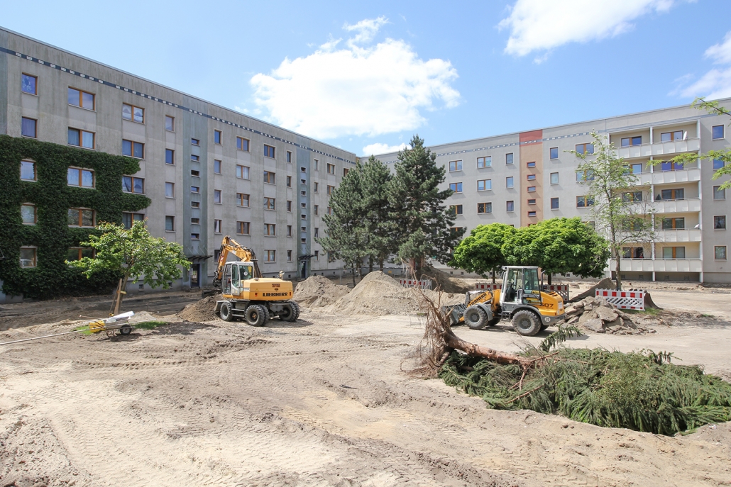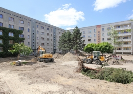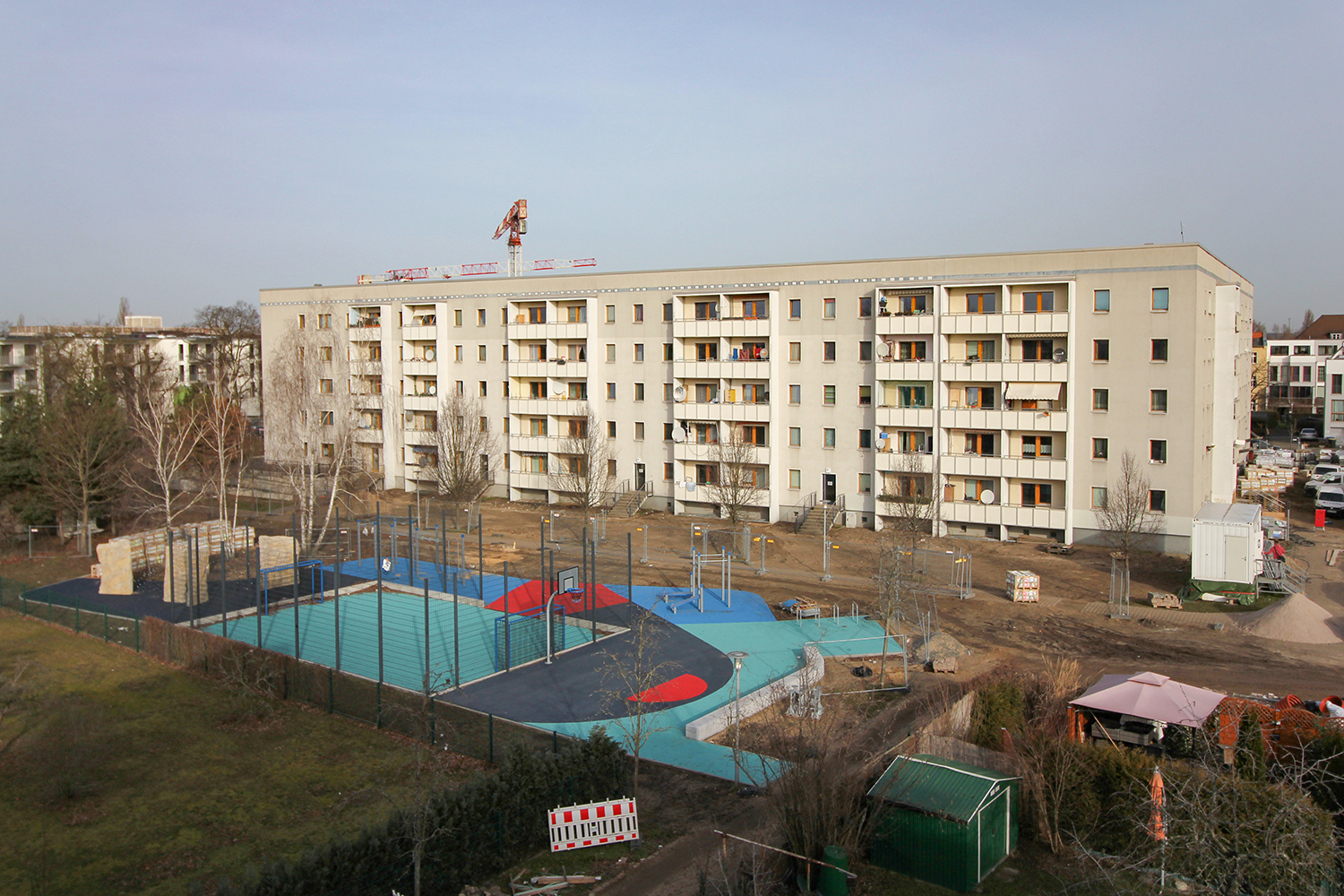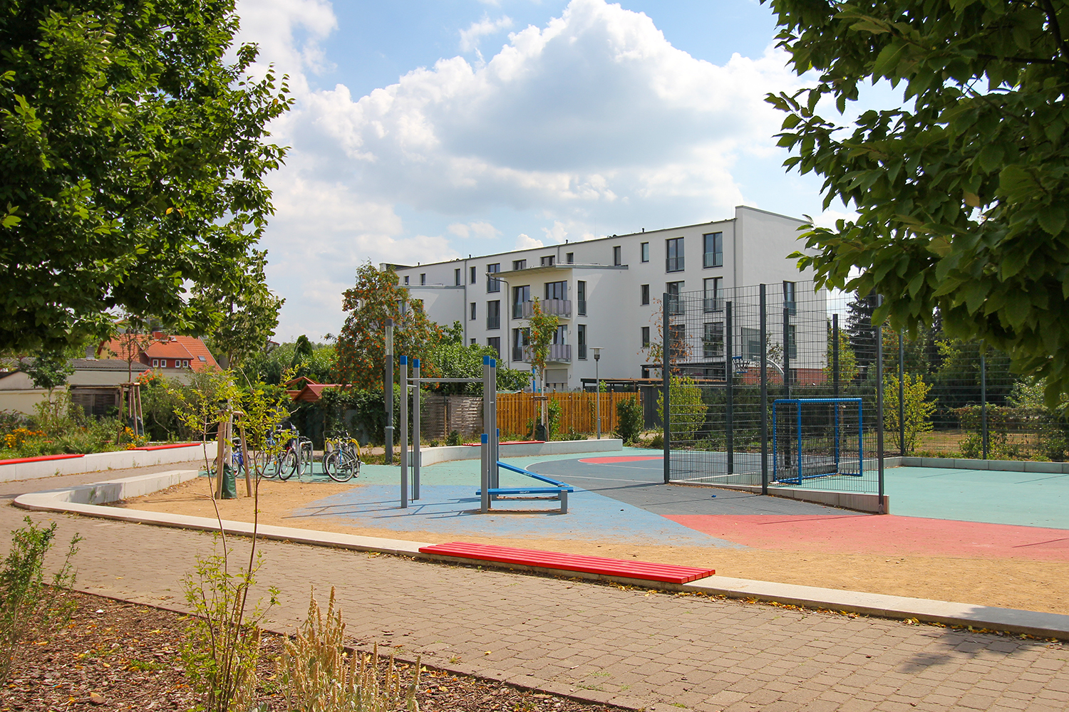 Die südlich und südöstlich an die Wohnblöcke Albert-Schweitzer-Straße 3-5 angrenzenden Freiflächen lagen teilweise ungenutzt brach. Heute verbinden sie das „alte“ Albert-Schweitzer-Quartier und die an der Fabrik-, August-Conrad- und Berliner Straße entstandene neue Wohnbebauung. Robuste und wartungsarme Outdoormöbel und Spielgeräte, neue Wege und Plätze sowie eine höhengestaffelte Bepflanzung aus bodendeckenden Gehölzen, Stauden und Gräsern, Solitärsträuchern und Laub- und Obstbäumen sorgen für eine hohe Aufenthaltsqualität für alle Altersgruppen. Durch das gesamte Quartier zieht sich ein Grüngürtel aus heimischen Pflanzen, die zur Steigerung der Biodiversität beitragen. Darin eingebettet finden sich Spiel- und Sportflächen mit Angeboten für verschiedene Altersgruppen, Aufenthalts- und Rasenflächen zur freien Nutzung, Hochbeete zum gemeinsamen Gärtnern, ein Bouleplatz, Wäschetrockenplätze und Sitzecken. Die im Quartier bereits vorhandenen Spielgeräte wurden durch weitere Anlagen zum Balancieren, Klettern, Hangeln, Rutschen und Schaukeln ergänzt. Bei der Auswahl lag der Fokus auf Spielgeräten, die sich gemeinschaftlich nutzen lassen. Der alte Bolzplatz wurde durch ein Multisportfeld mit Toren, Streetballkorb und lärmminderndem Kunststoffbelag ersetzt. Kleine Kletterfelsen sowie mehrere Fitnessgeräte laden zur sportlichen Betätigung ein.