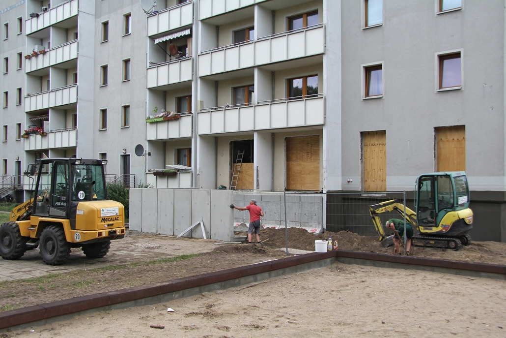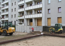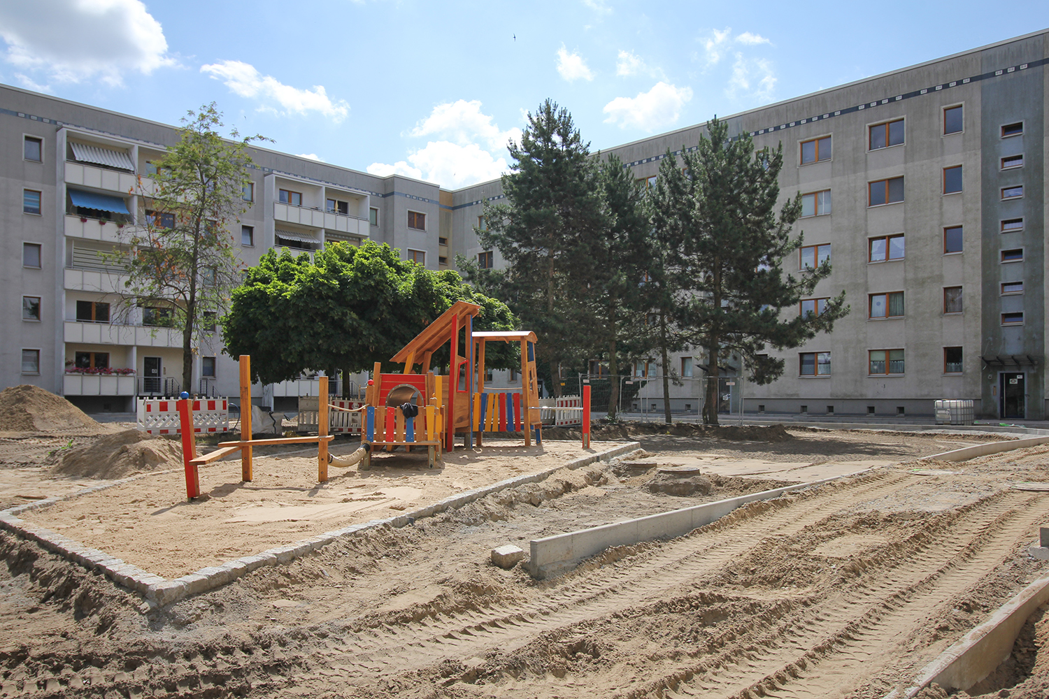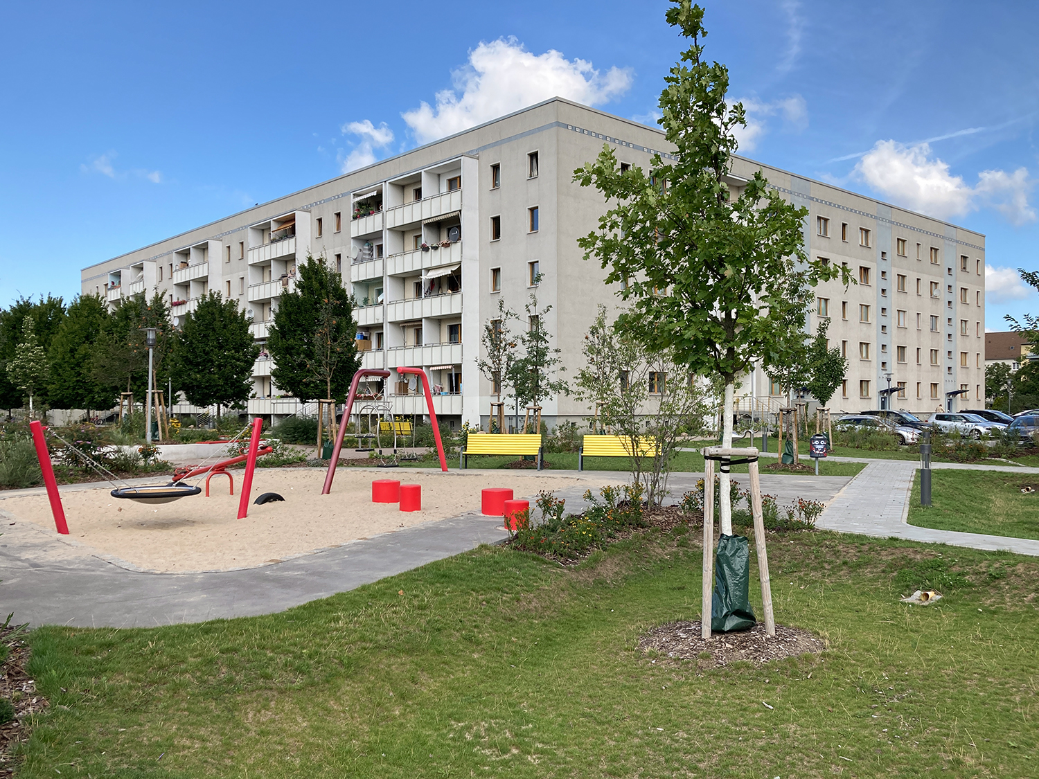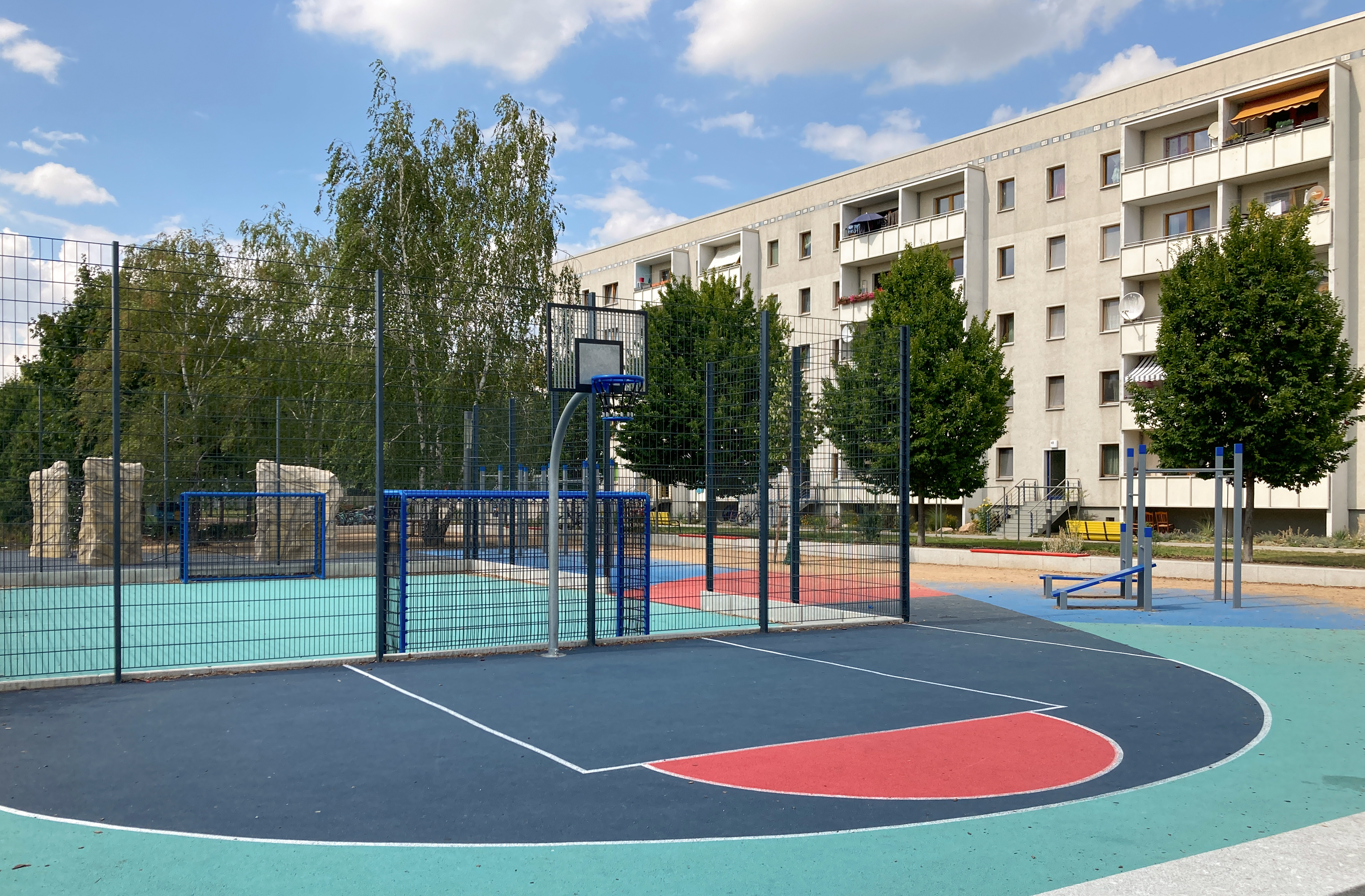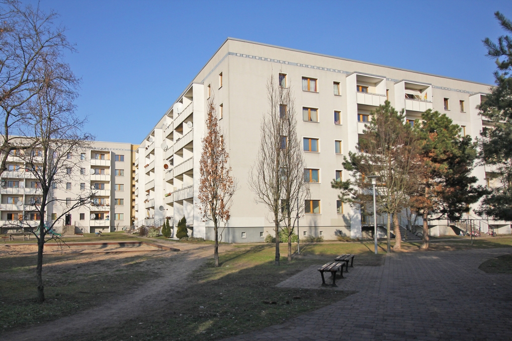 Die südlich und südöstlich an die Wohnblöcke Albert-Schweitzer-Straße 3-5 angrenzenden Freiflächen lagen teilweise ungenutzt brach. Heute verbinden sie das „alte“ Albert-Schweitzer-Quartier und die an der Fabrik-, August-Conrad- und Berliner Straße entstandene neue Wohnbebauung. Robuste und wartungsarme Outdoormöbel und Spielgeräte, neue Wege und Plätze sowie eine höhengestaffelte Bepflanzung aus bodendeckenden Gehölzen, Stauden und Gräsern, Solitärsträuchern und Laub- und Obstbäumen sorgen für eine hohe Aufenthaltsqualität für alle Altersgruppen. Durch das gesamte Quartier zieht sich ein Grüngürtel aus heimischen Pflanzen, die zur Steigerung der Biodiversität beitragen. Darin eingebettet finden sich Spiel- und Sportflächen mit Angeboten für verschiedene Altersgruppen, Aufenthalts- und Rasenflächen zur freien Nutzung, Hochbeete zum gemeinsamen Gärtnern, ein Bouleplatz, Wäschetrockenplätze und Sitzecken. Die im Quartier bereits vorhandenen Spielgeräte wurden durch weitere Anlagen zum Balancieren, Klettern, Hangeln, Rutschen und Schaukeln ergänzt. Bei der Auswahl lag der Fokus auf Spielgeräten, die sich gemeinschaftlich nutzen lassen. Der alte Bolzplatz wurde durch ein Multisportfeld mit Toren, Streetballkorb und lärmminderndem Kunststoffbelag ersetzt. Kleine Kletterfelsen sowie mehrere Fitnessgeräte laden zur sportlichen Betätigung ein.