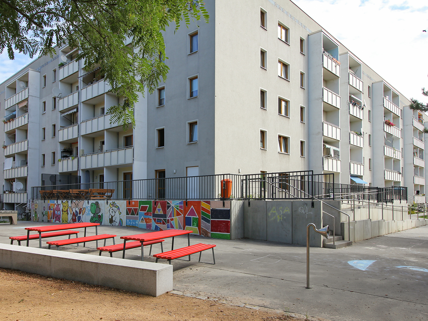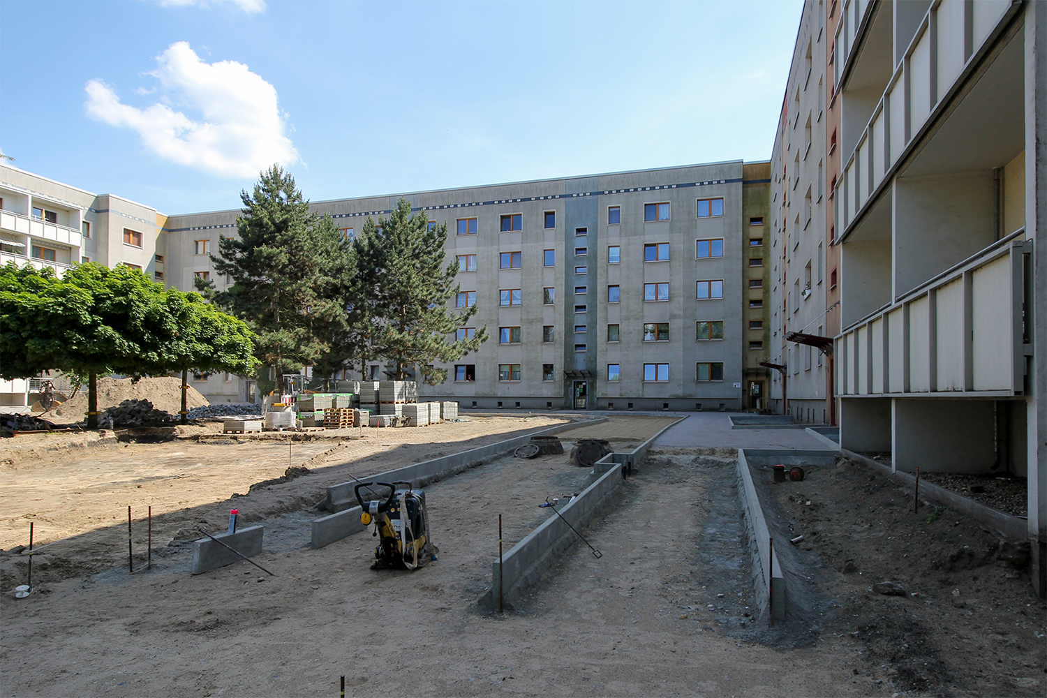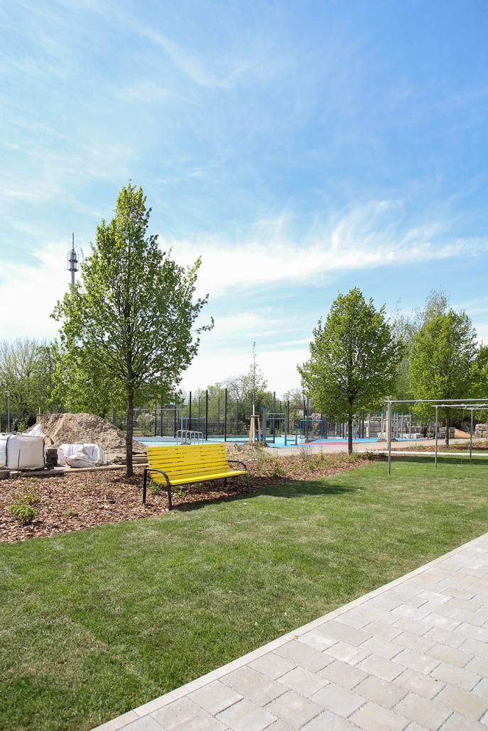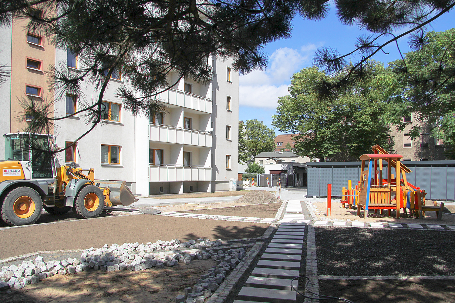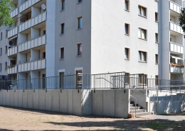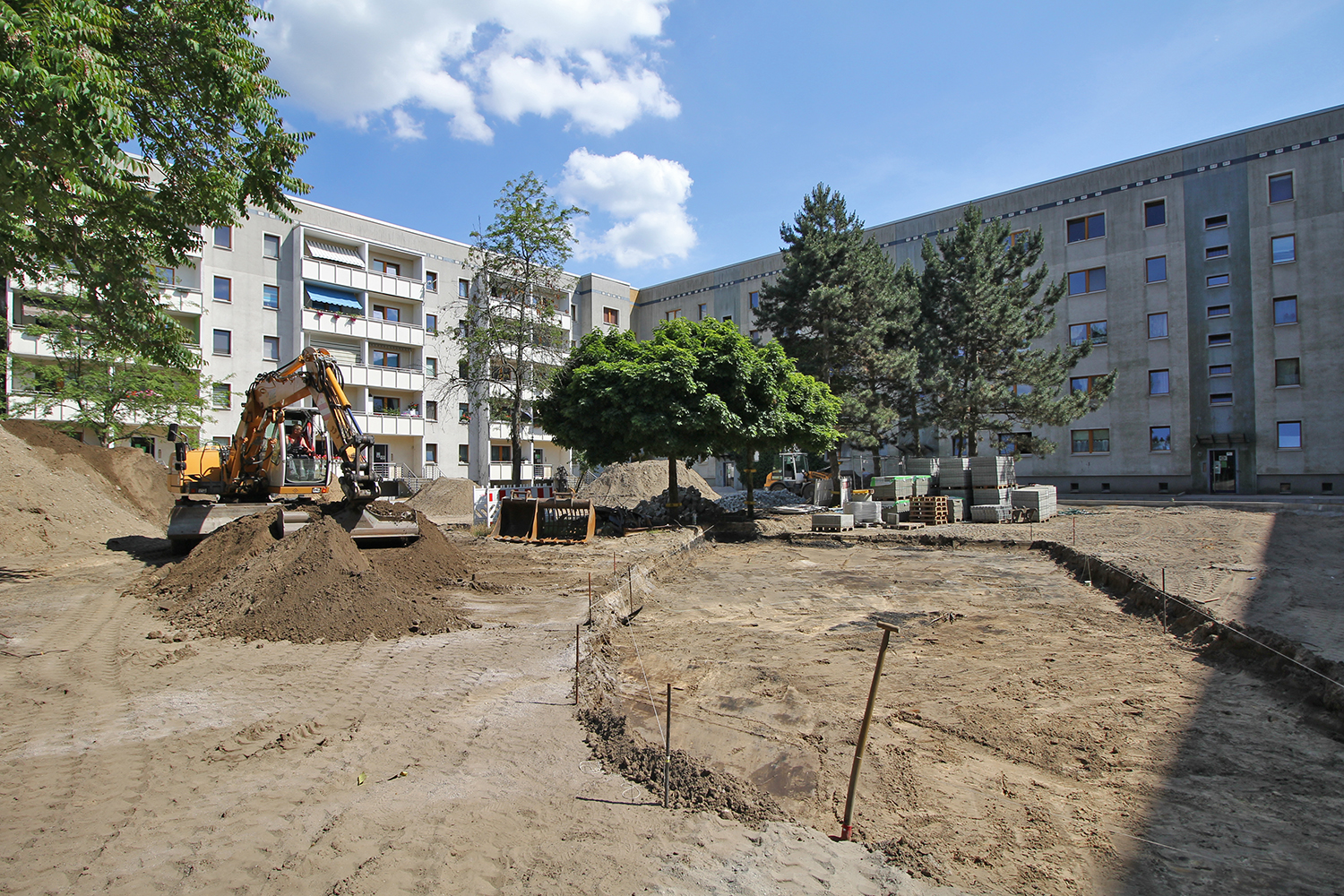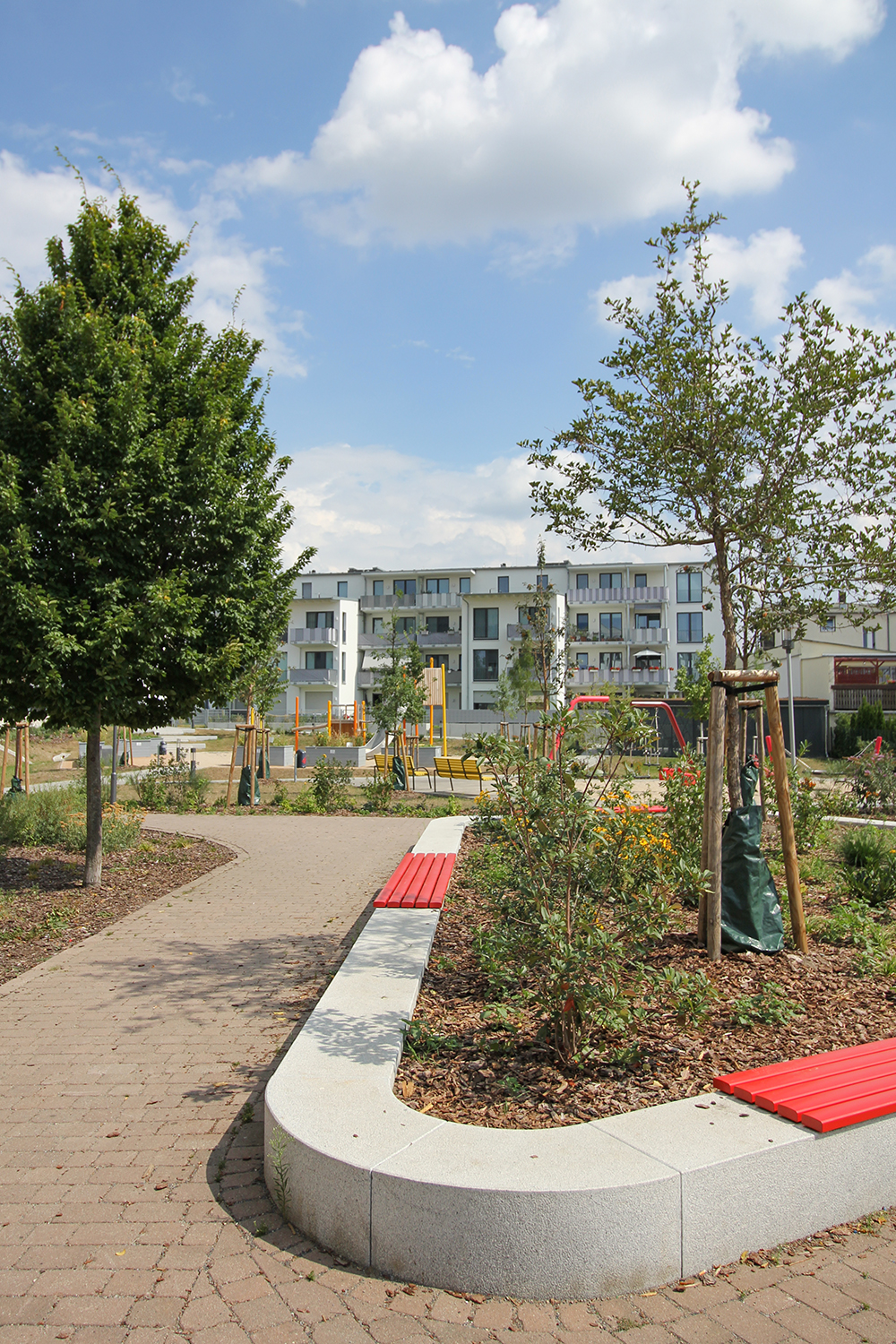 Die südlich und südöstlich an die Wohnblöcke Albert-Schweitzer-Straße 3-5 angrenzenden Freiflächen lagen teilweise ungenutzt brach. Heute verbinden sie das „alte“ Albert-Schweitzer-Quartier und die an der Fabrik-, August-Conrad- und Berliner Straße entstandene neue Wohnbebauung. Robuste und wartungsarme Outdoormöbel und Spielgeräte, neue Wege und Plätze sowie eine höhengestaffelte Bepflanzung aus bodendeckenden Gehölzen, Stauden und Gräsern, Solitärsträuchern und Laub- und Obstbäumen sorgen für eine hohe Aufenthaltsqualität für alle Altersgruppen. Durch das gesamte Quartier zieht sich ein Grüngürtel aus heimischen Pflanzen, die zur Steigerung der Biodiversität beitragen. Darin eingebettet finden sich Spiel- und Sportflächen mit Angeboten für verschiedene Altersgruppen, Aufenthalts- und Rasenflächen zur freien Nutzung, Hochbeete zum gemeinsamen Gärtnern, ein Bouleplatz, Wäschetrockenplätze und Sitzecken. Die im Quartier bereits vorhandenen Spielgeräte wurden durch weitere Anlagen zum Balancieren, Klettern, Hangeln, Rutschen und Schaukeln ergänzt. Bei der Auswahl lag der Fokus auf Spielgeräten, die sich gemeinschaftlich nutzen lassen. Der alte Bolzplatz wurde durch ein Multisportfeld mit Toren, Streetballkorb und lärmminderndem Kunststoffbelag ersetzt. Kleine Kletterfelsen sowie mehrere Fitnessgeräte laden zur sportlichen Betätigung ein.