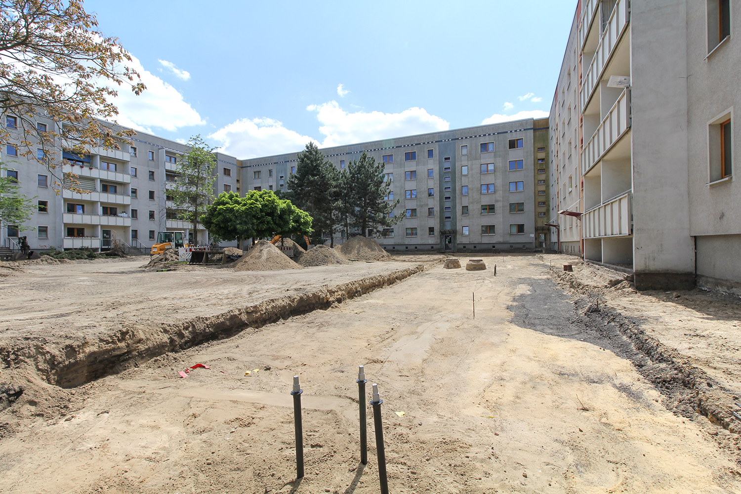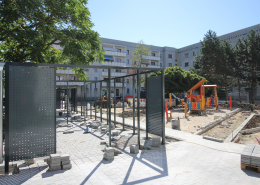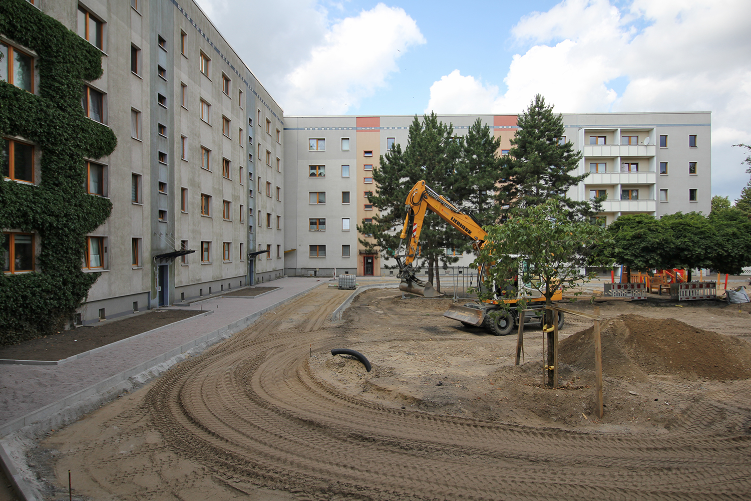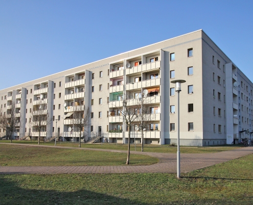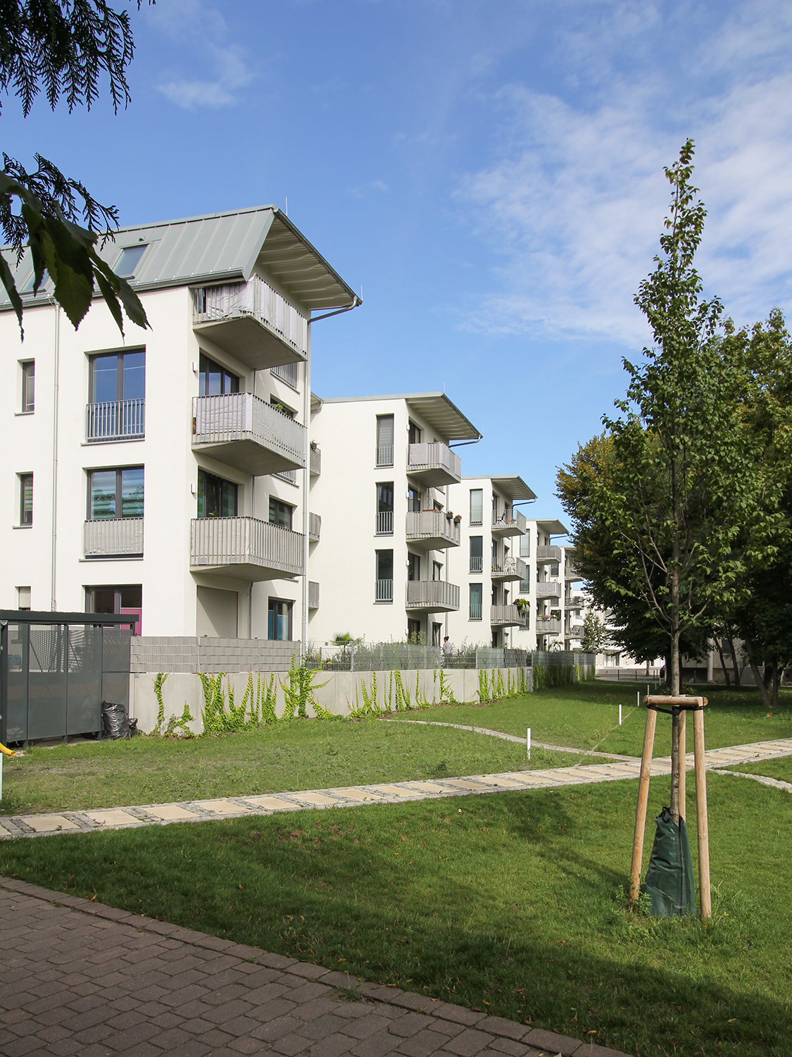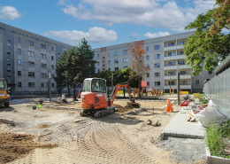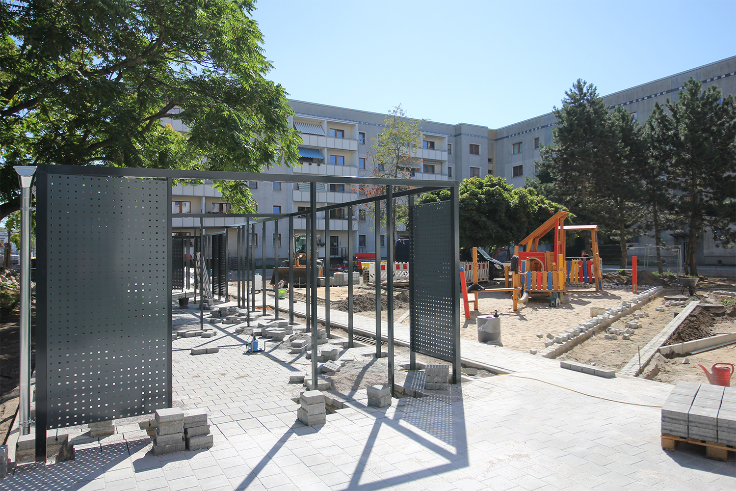 Die südlich und südöstlich an die Wohnblöcke Albert-Schweitzer-Straße 3-5 angrenzenden Freiflächen lagen teilweise ungenutzt brach. Heute verbinden sie das „alte“ Albert-Schweitzer-Quartier und die an der Fabrik-, August-Conrad- und Berliner Straße entstandene neue Wohnbebauung. Robuste und wartungsarme Outdoormöbel und Spielgeräte, neue Wege und Plätze sowie eine höhengestaffelte Bepflanzung aus bodendeckenden Gehölzen, Stauden und Gräsern, Solitärsträuchern und Laub- und Obstbäumen sorgen für eine hohe Aufenthaltsqualität für alle Altersgruppen. Durch das gesamte Quartier zieht sich ein Grüngürtel aus heimischen Pflanzen, die zur Steigerung der Biodiversität beitragen. Darin eingebettet finden sich Spiel- und Sportflächen mit Angeboten für verschiedene Altersgruppen, Aufenthalts- und Rasenflächen zur freien Nutzung, Hochbeete zum gemeinsamen Gärtnern, ein Bouleplatz, Wäschetrockenplätze und Sitzecken. Die im Quartier bereits vorhandenen Spielgeräte wurden durch weitere Anlagen zum Balancieren, Klettern, Hangeln, Rutschen und Schaukeln ergänzt. Bei der Auswahl lag der Fokus auf Spielgeräten, die sich gemeinschaftlich nutzen lassen. Der alte Bolzplatz wurde durch ein Multisportfeld mit Toren, Streetballkorb und lärmminderndem Kunststoffbelag ersetzt. Kleine Kletterfelsen sowie mehrere Fitnessgeräte laden zur sportlichen Betätigung ein.