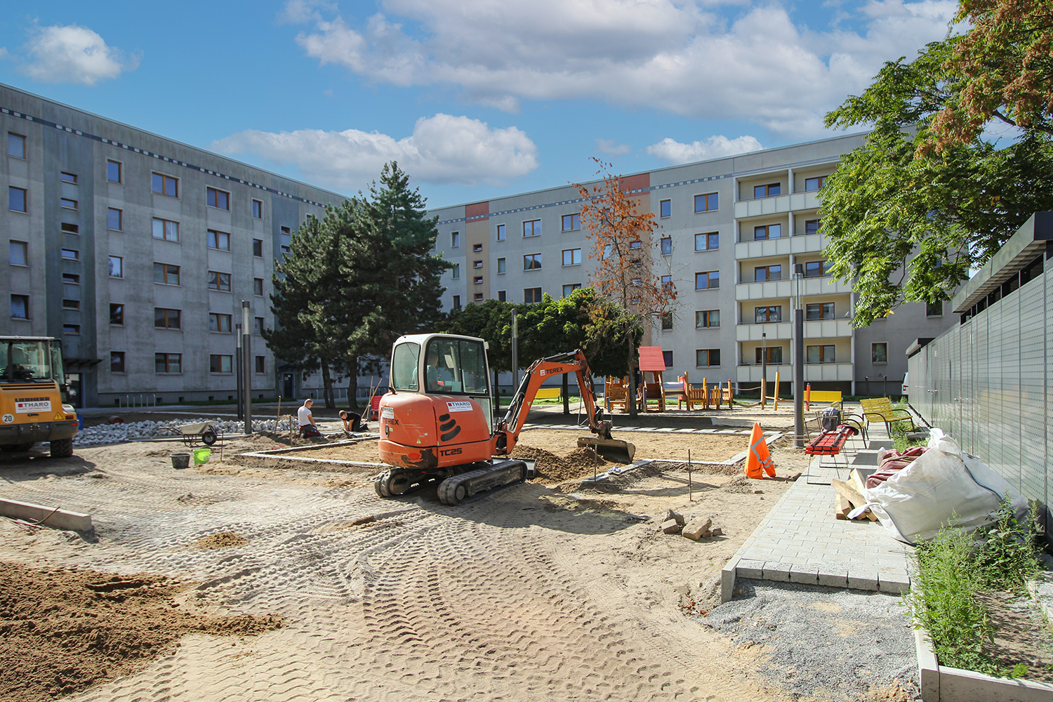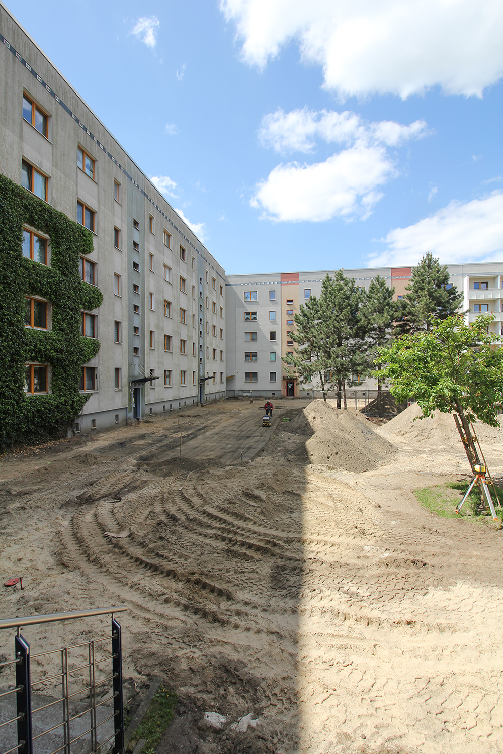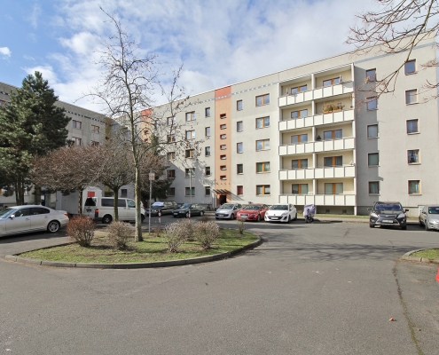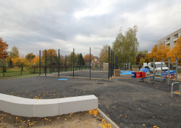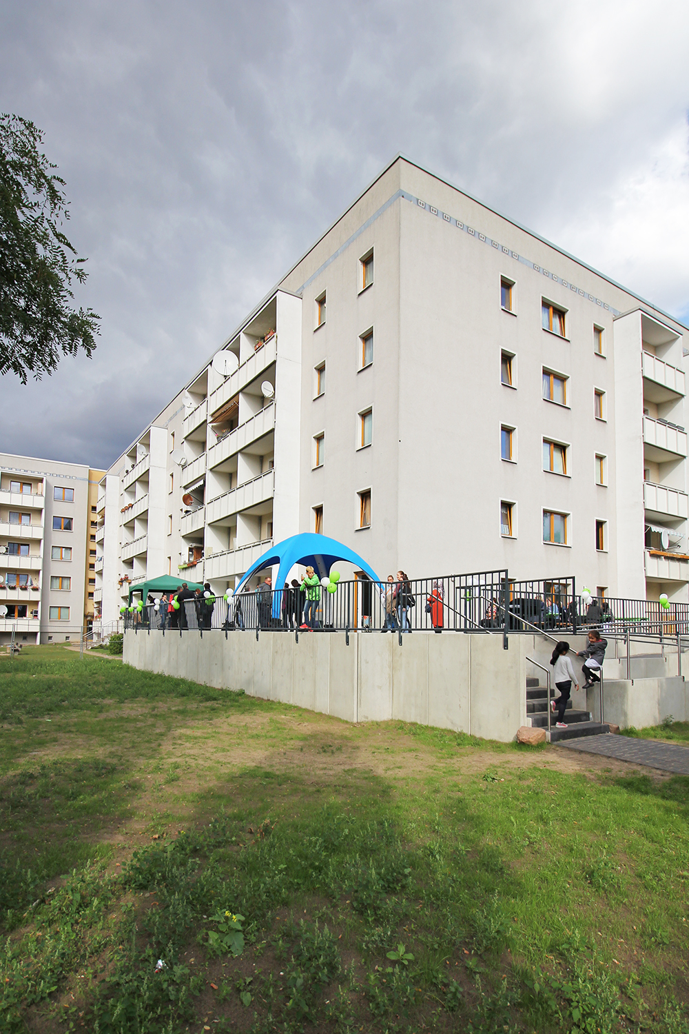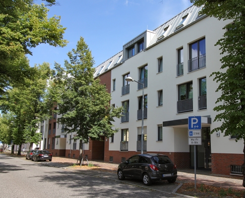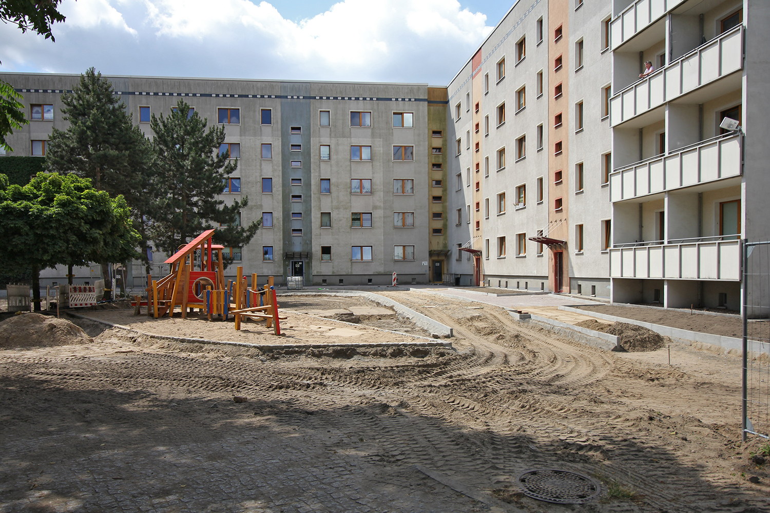 Die südlich und südöstlich an die Wohnblöcke Albert-Schweitzer-Straße 3-5 angrenzenden Freiflächen lagen teilweise ungenutzt brach. Heute verbinden sie das „alte“ Albert-Schweitzer-Quartier und die an der Fabrik-, August-Conrad- und Berliner Straße entstandene neue Wohnbebauung. Robuste und wartungsarme Outdoormöbel und Spielgeräte, neue Wege und Plätze sowie eine höhengestaffelte Bepflanzung aus bodendeckenden Gehölzen, Stauden und Gräsern, Solitärsträuchern und Laub- und Obstbäumen sorgen für eine hohe Aufenthaltsqualität für alle Altersgruppen. Durch das gesamte Quartier zieht sich ein Grüngürtel aus heimischen Pflanzen, die zur Steigerung der Biodiversität beitragen. Darin eingebettet finden sich Spiel- und Sportflächen mit Angeboten für verschiedene Altersgruppen, Aufenthalts- und Rasenflächen zur freien Nutzung, Hochbeete zum gemeinsamen Gärtnern, ein Bouleplatz, Wäschetrockenplätze und Sitzecken. Die im Quartier bereits vorhandenen Spielgeräte wurden durch weitere Anlagen zum Balancieren, Klettern, Hangeln, Rutschen und Schaukeln ergänzt. Bei der Auswahl lag der Fokus auf Spielgeräten, die sich gemeinschaftlich nutzen lassen. Der alte Bolzplatz wurde durch ein Multisportfeld mit Toren, Streetballkorb und lärmminderndem Kunststoffbelag ersetzt. Kleine Kletterfelsen sowie mehrere Fitnessgeräte laden zur sportlichen Betätigung ein.