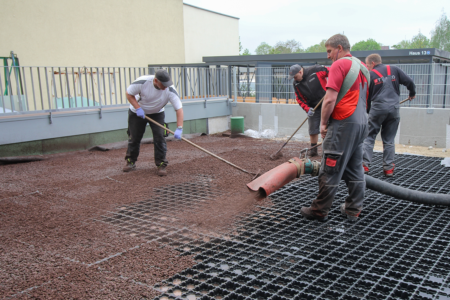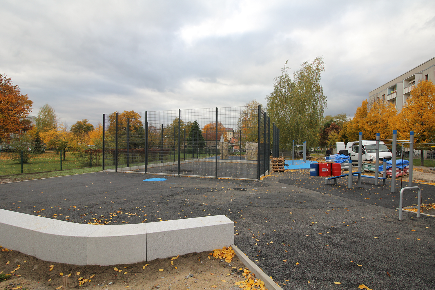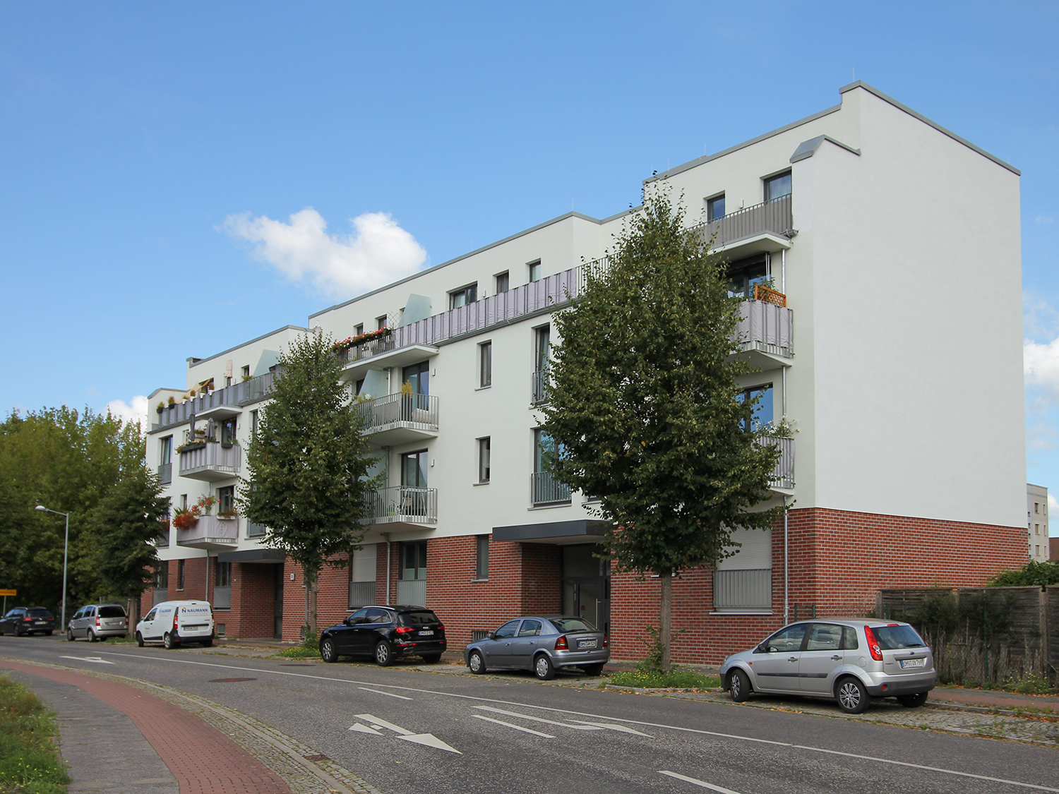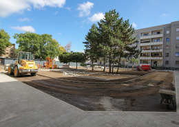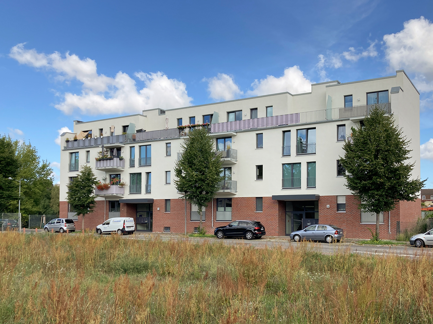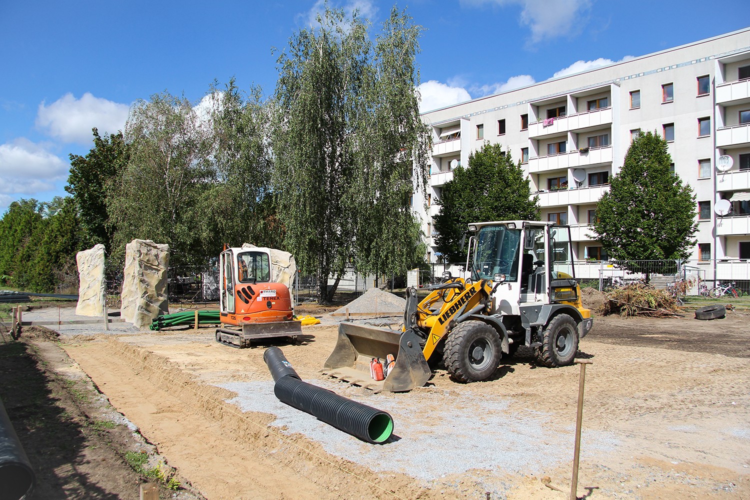 Die südlich und südöstlich an die Wohnblöcke Albert-Schweitzer-Straße 3-5 angrenzenden Freiflächen lagen teilweise ungenutzt brach. Heute verbinden sie das „alte“ Albert-Schweitzer-Quartier und die an der Fabrik-, August-Conrad- und Berliner Straße entstandene neue Wohnbebauung. Robuste und wartungsarme Outdoormöbel und Spielgeräte, neue Wege und Plätze sowie eine höhengestaffelte Bepflanzung aus bodendeckenden Gehölzen, Stauden und Gräsern, Solitärsträuchern und Laub- und Obstbäumen sorgen für eine hohe Aufenthaltsqualität für alle Altersgruppen. Durch das gesamte Quartier zieht sich ein Grüngürtel aus heimischen Pflanzen, die zur Steigerung der Biodiversität beitragen. Darin eingebettet finden sich Spiel- und Sportflächen mit Angeboten für verschiedene Altersgruppen, Aufenthalts- und Rasenflächen zur freien Nutzung, Hochbeete zum gemeinsamen Gärtnern, ein Bouleplatz, Wäschetrockenplätze und Sitzecken. Die im Quartier bereits vorhandenen Spielgeräte wurden durch weitere Anlagen zum Balancieren, Klettern, Hangeln, Rutschen und Schaukeln ergänzt. Bei der Auswahl lag der Fokus auf Spielgeräten, die sich gemeinschaftlich nutzen lassen. Der alte Bolzplatz wurde durch ein Multisportfeld mit Toren, Streetballkorb und lärmminderndem Kunststoffbelag ersetzt. Kleine Kletterfelsen sowie mehrere Fitnessgeräte laden zur sportlichen Betätigung ein.