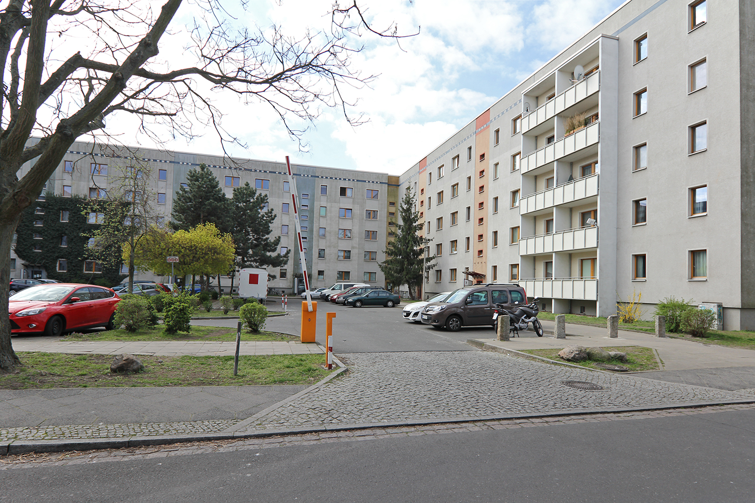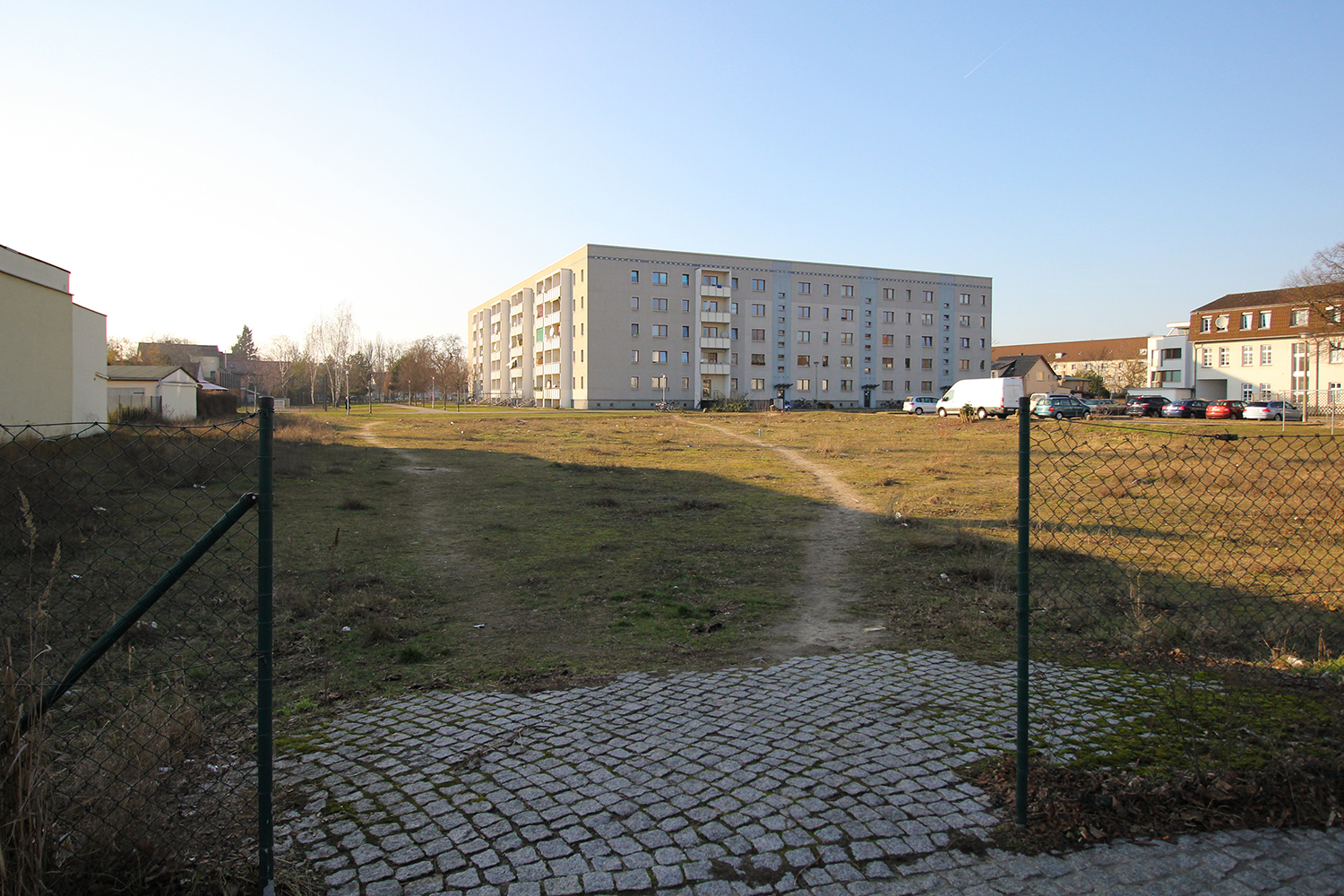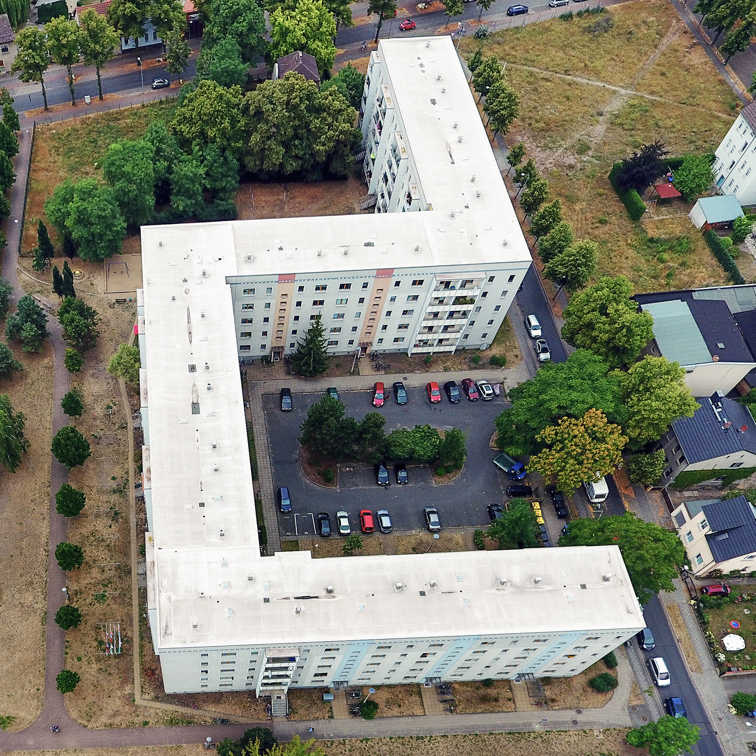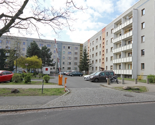 Drei der Blöcke sind u-förmig angeordnet und bilden einen zur Albert-Schweitzer-Straße offenen Hof. Dieser ist weitgehend versiegelt und wird zum Abstellen privater Pkw genutzt. Südlich und südöstlich des Gebäudekomplexes schließen sich Grün-, Spiel- und Brachflächen mit nur geringer Aufenthaltsqualität an.