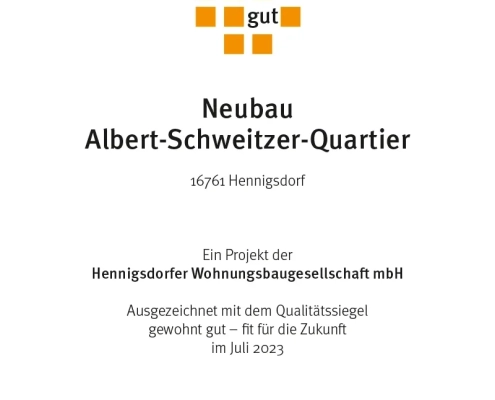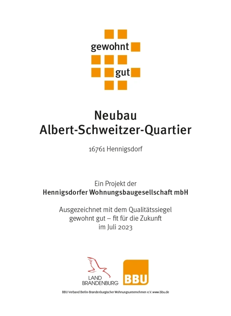 Im Juli 2023 haben BBU-Vorständin Maren Kern und Brandenburgs Infrastrukturminister Guido Beermann den Neubau von 114 Wohnungen und die ganzheitliche Entwicklung des Albert-Schweitzer-Quartiers mit dem Qualitätssiegel „Gewohnt gut – fit für die Zukunft“ ausgezeichnet.