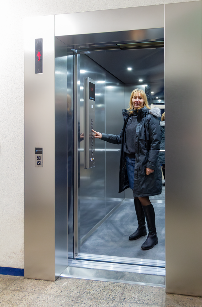 Fahrt frei. HWB-Mitarbeiterin Anja Vogel konnte nach sechseinhalb Wochen Bauzeit den neuen Aufzug in Betrieb nehmen.